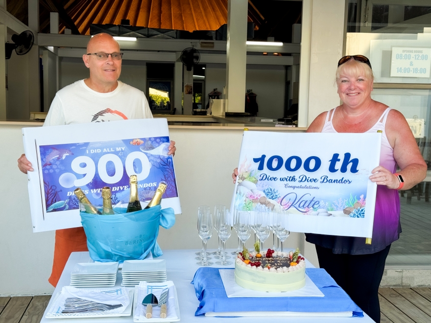 Bandos Maldives recently celebrated a remarkable achievement with two of its most loyal guests, Kate and Andy, who share a decades-long connection with the island. Andy reached an incredible milestone of completing his 900th dive, every single one of them with Dive Bandos.