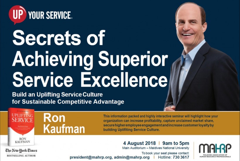Maldives Association of Human Resource Professionals (MAHRP) is delighted to announce our partnership with Up Your Service Singapore to bring Ron Kaufman to the Maldives. This event is titled as Secrets of Achieving Superior Service Excellence and is scheduled for Saturday 4 August 2018 from 9 am to 5 pm at the Main Auditorium of the Maldives National University.
