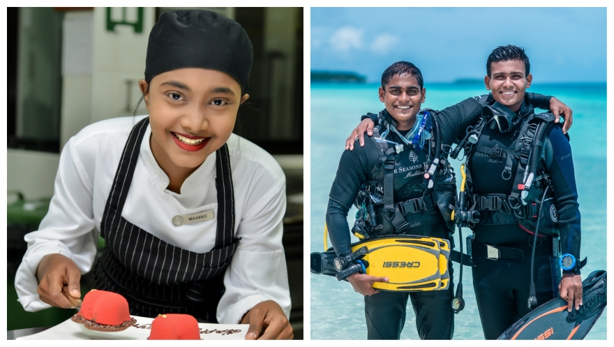 Whilst living, studying and working onsite at Four Seasons two Resort islands of Kuda Huraa and Landaa Giraavaru, apprentices gain hands-on experience in their chosen discipline: Food & Beverage Preparation or Service, Safe Maritime Transport, Housekeeping & Guest Services, PADI Dive Master, Water Sports Attendant, Marine Biology plus 2021’s two new disciplines for second year apprentices: Front Office & Recreation Attendant and Safe Maritime Transport & Boat Mechanic.